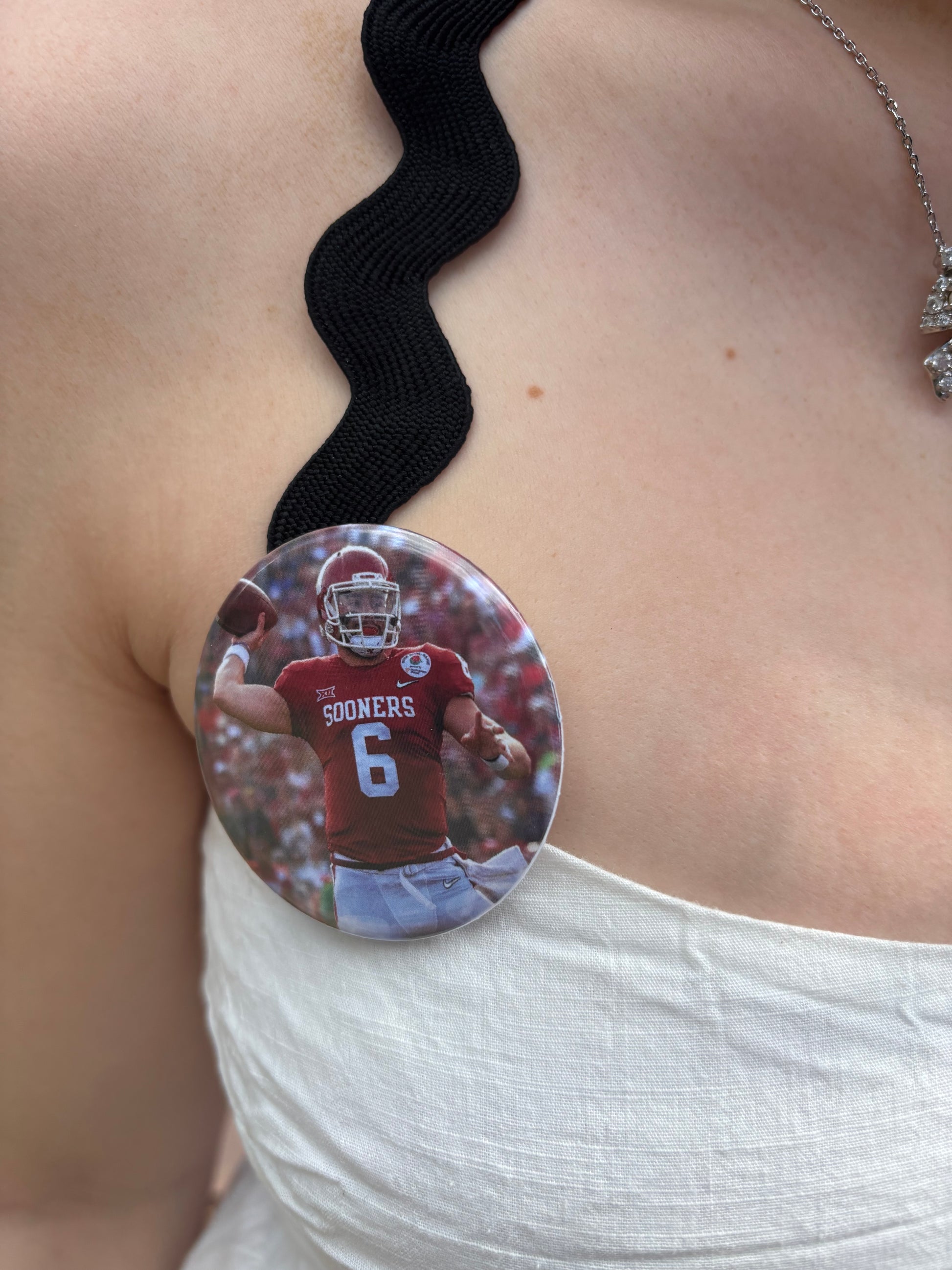 Celebrate one of the greatest Sooners of all time with this Baker Mayfield button. Channeling the energy of #6 on game day, this design is perfect for fans who remember the fire, grit, and legendary moments he brought to OU football.
