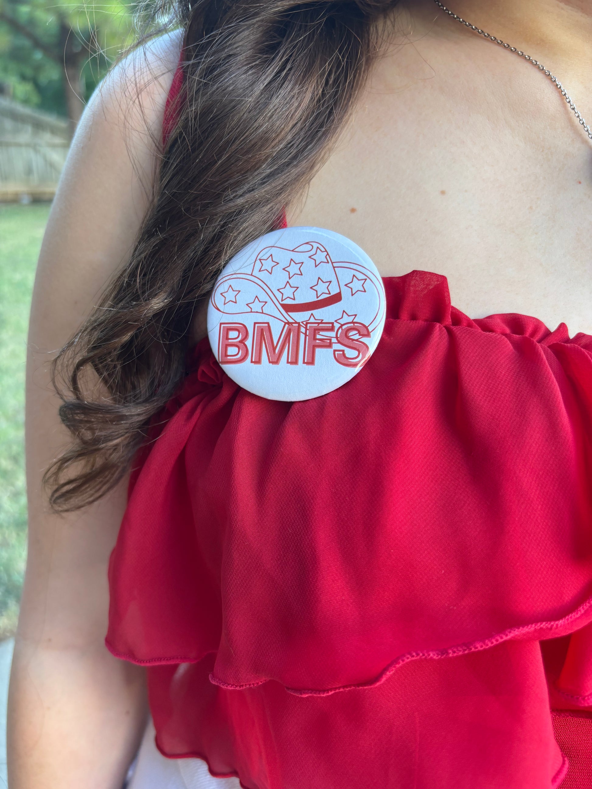 Western-inspired with a bold twist, this star-studded cowboy hat design is made for the fan who knows how to bring the energy on game day. Whether you wear it with boots, denim, or your favorite stadium ‘fit, this button is sure to stand out in the crowd.