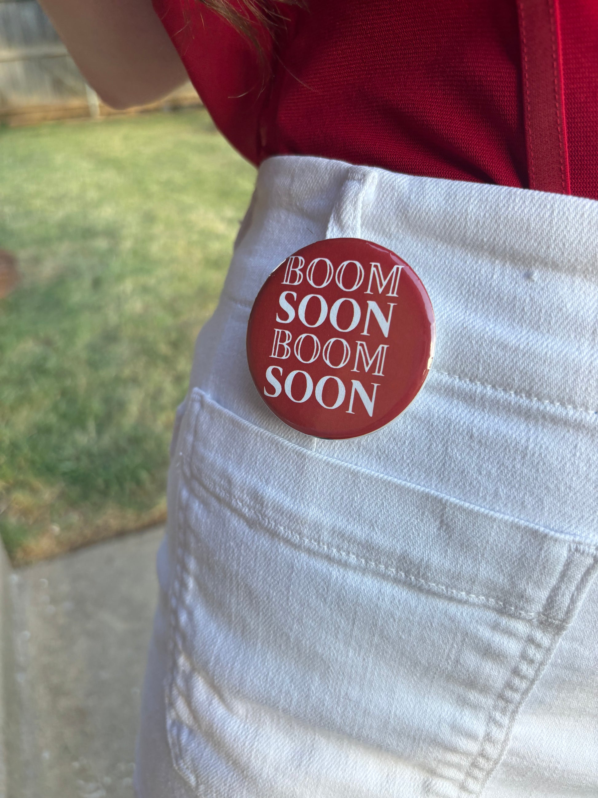 Bring the energy to gameday with this bold, triple-stacked “Boom Soon” design. Perfect for rallying the crowd or showing off your unstoppable Sooner spirit, this button is a standout piece for fans who love to go big with their team pride.
