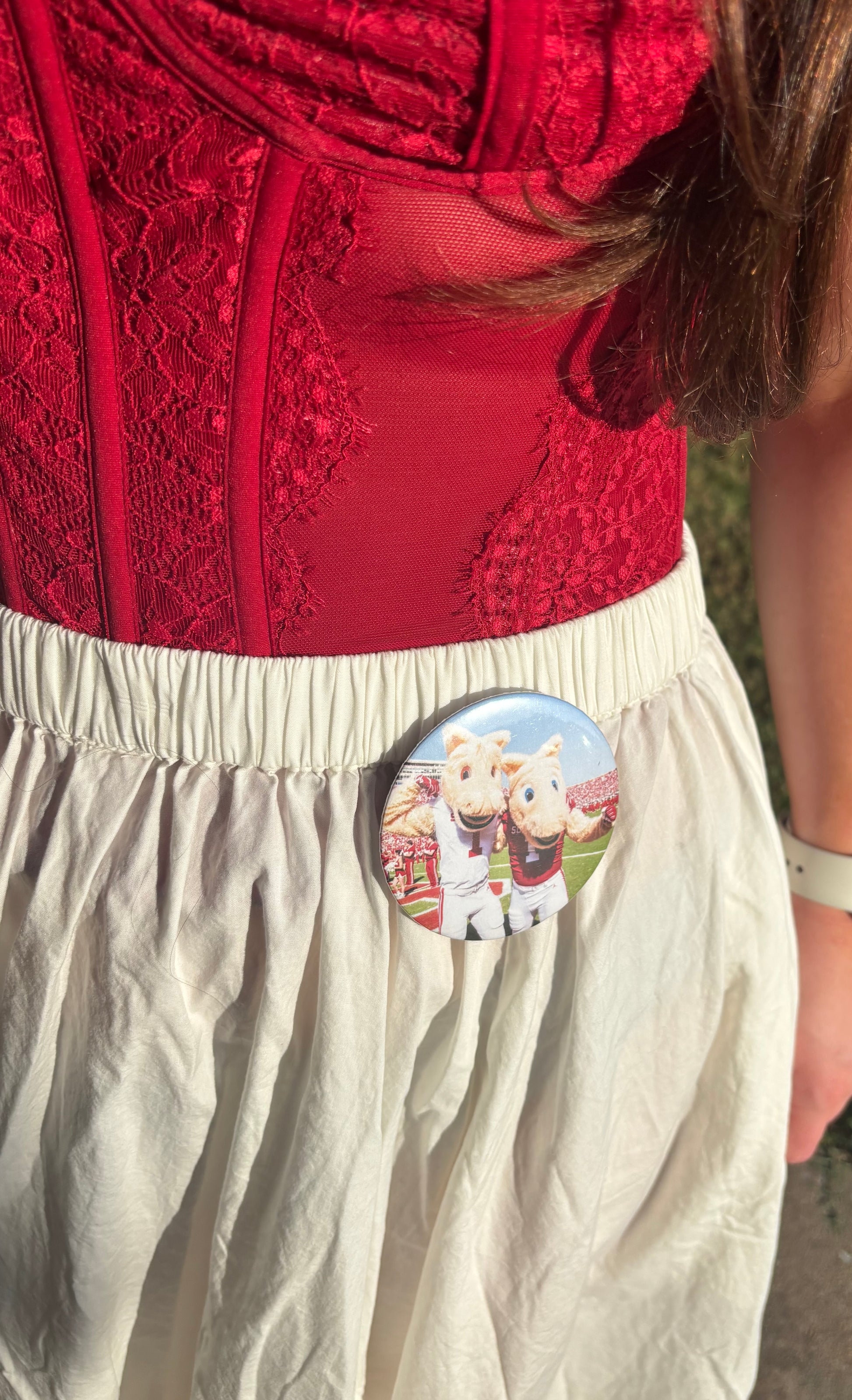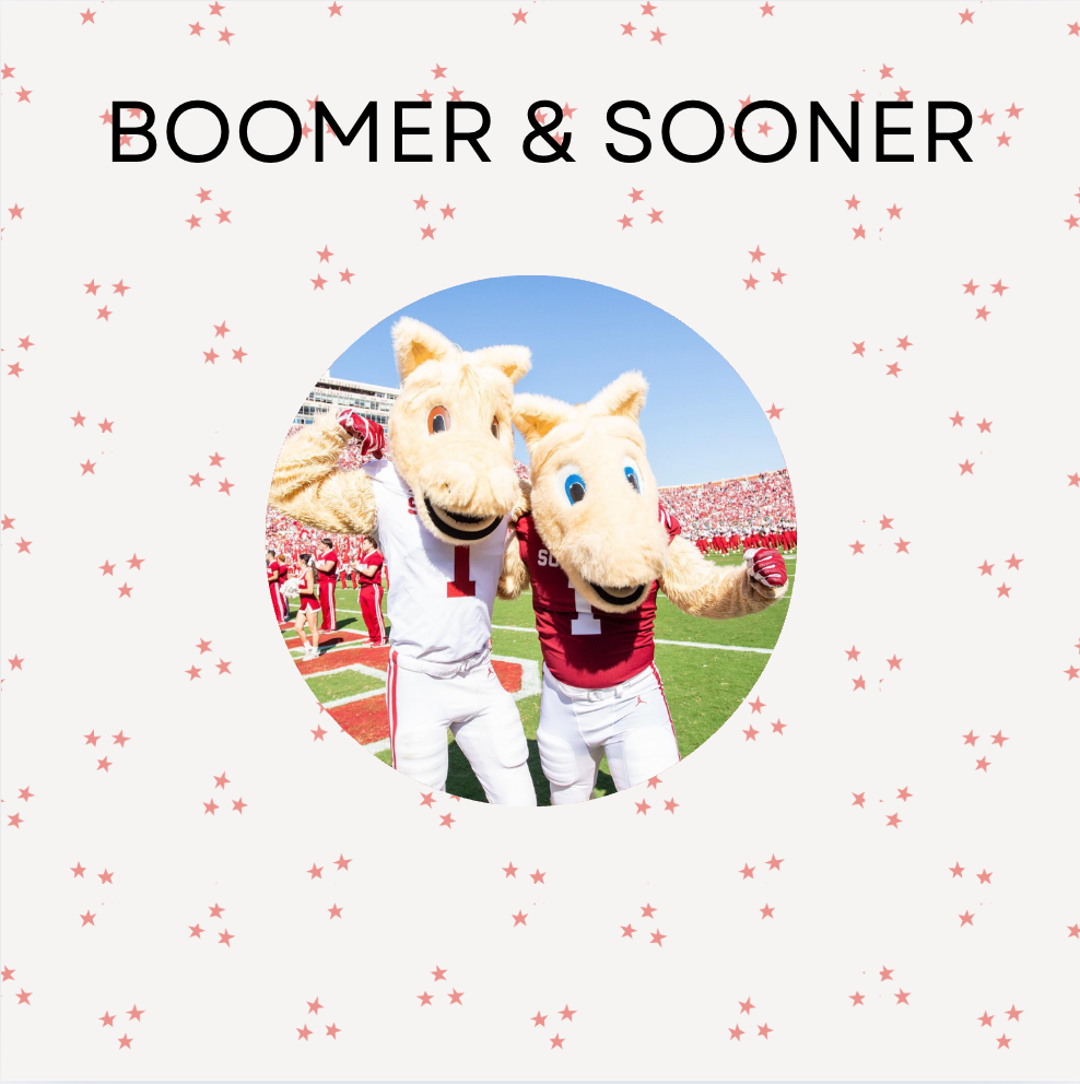 Celebrate the ultimate OU icons with this Boomer & Sooner button. Featuring the beloved ponies that lead the Sooner Schooner, this design captures the heart and tradition of gameday. A must-have for fans who love the spirit and history behind Sooner Nation.