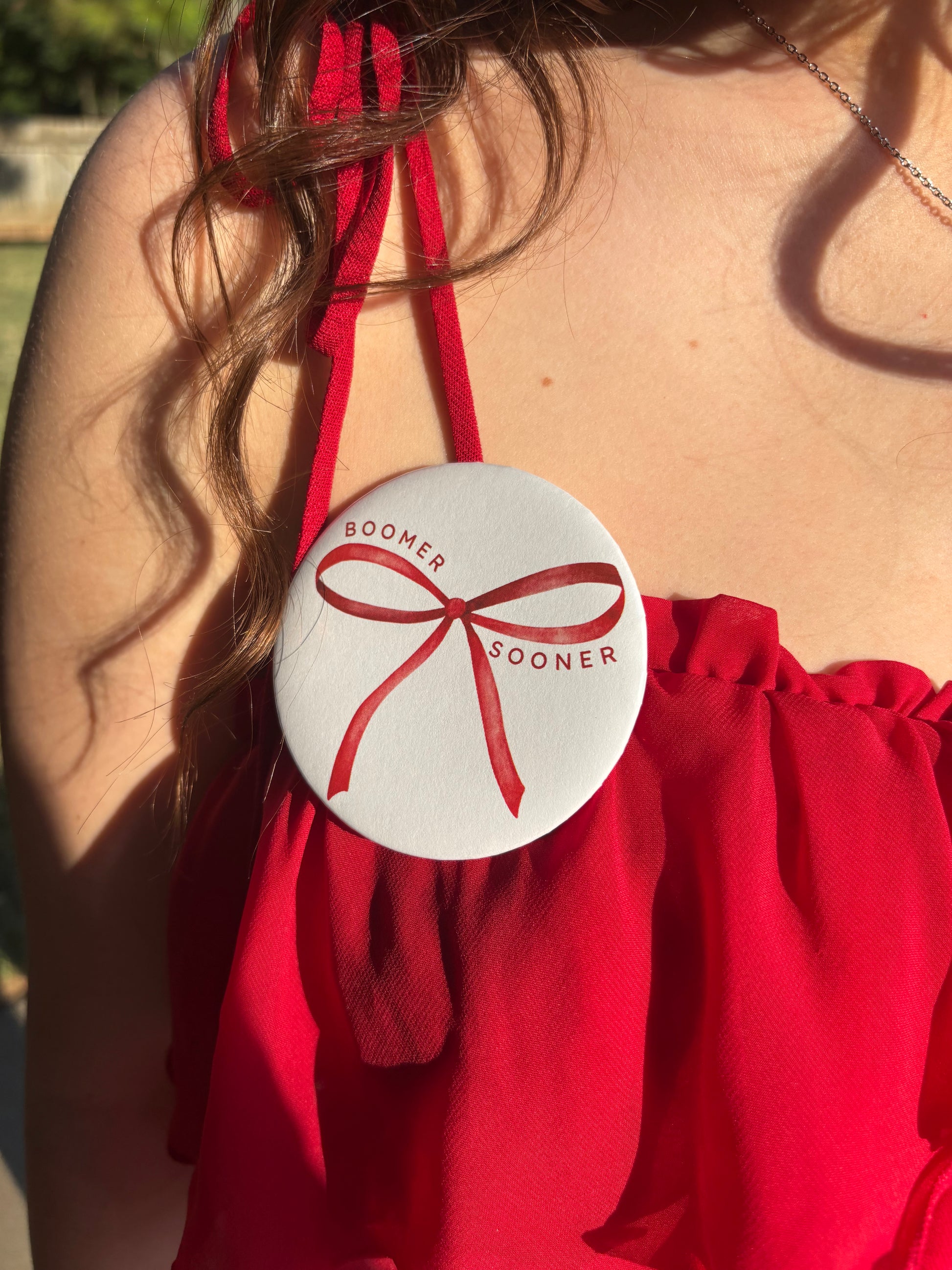 Sweet, spirited, and made for the girls who love a little extra charm on game day. This bow design brings a feminine twist to classic OU pride, perfect for pairing with dresses, denim jackets, or your favorite gameday top.