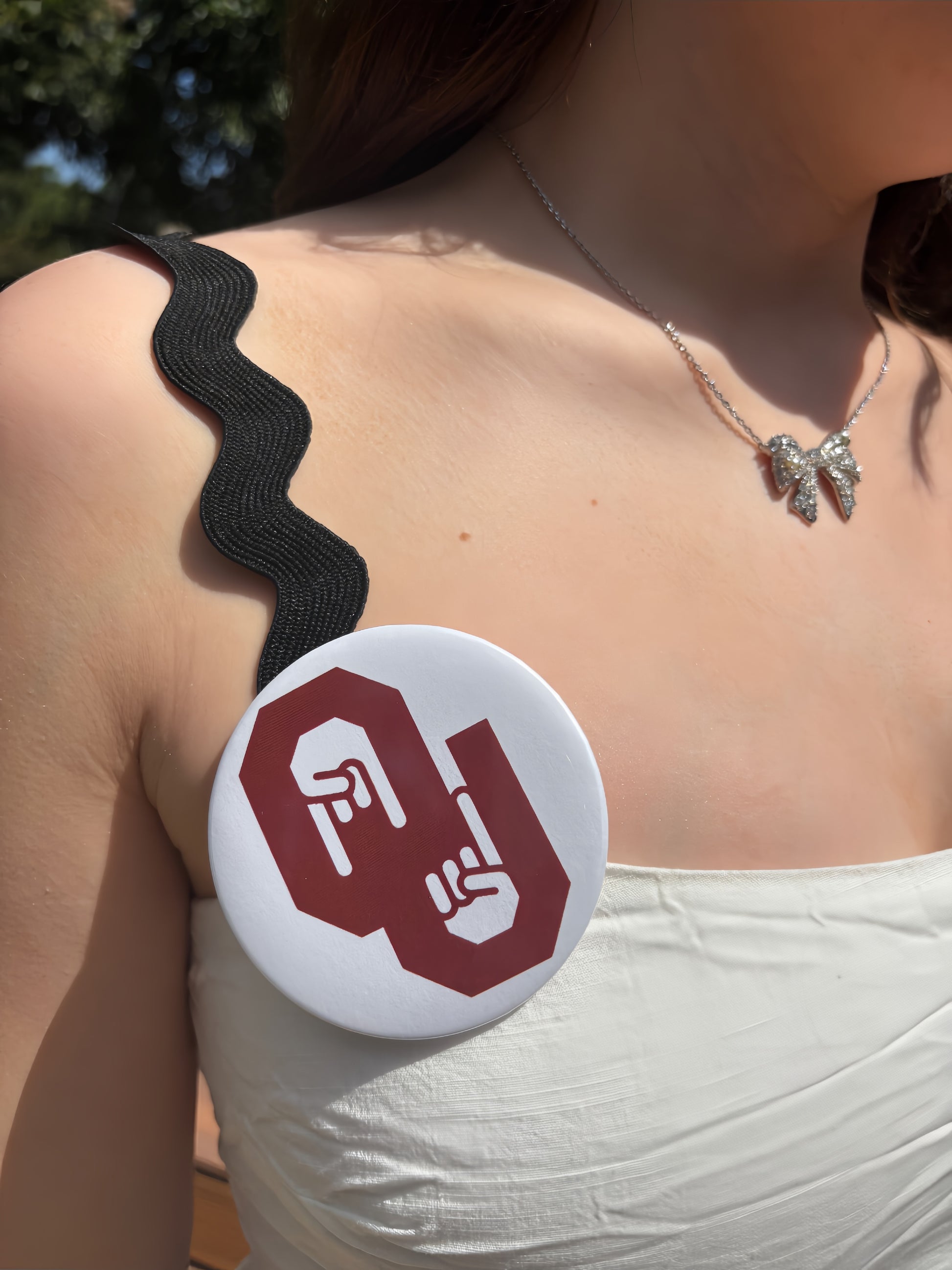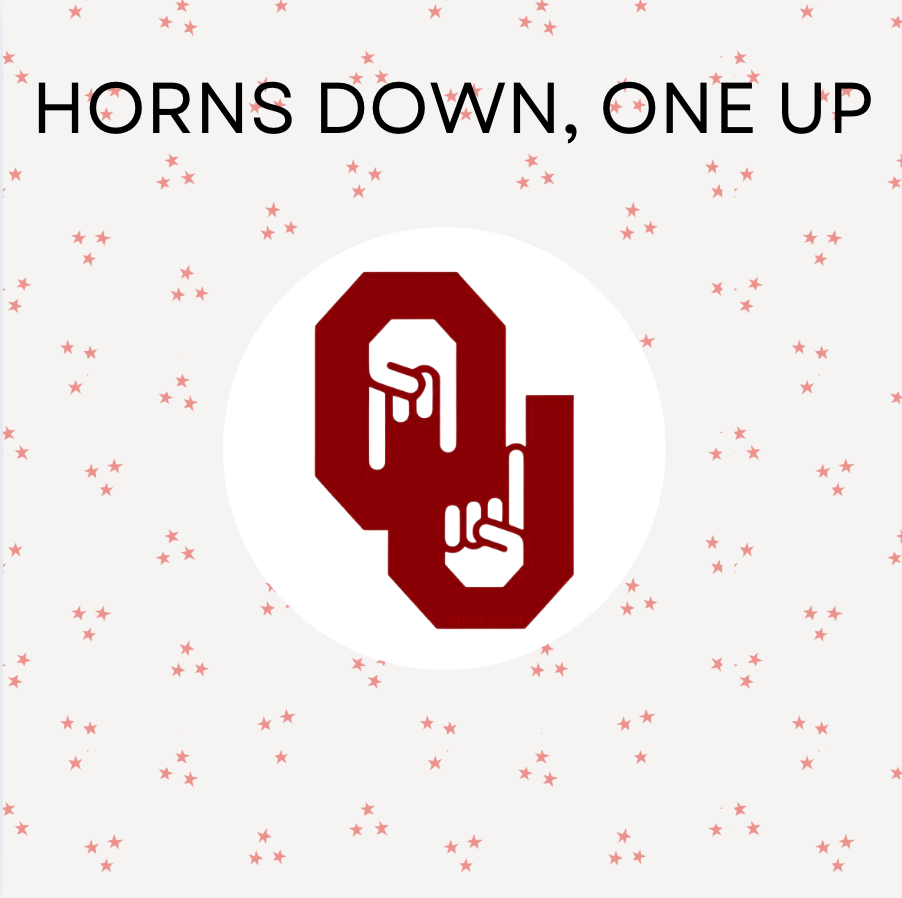Show your Sooner pride with this bold twist on tradition, one finger pointing up for OU and one horns down for the rivalry. The perfect button for game day tailgates, and cheering loud in the stands.