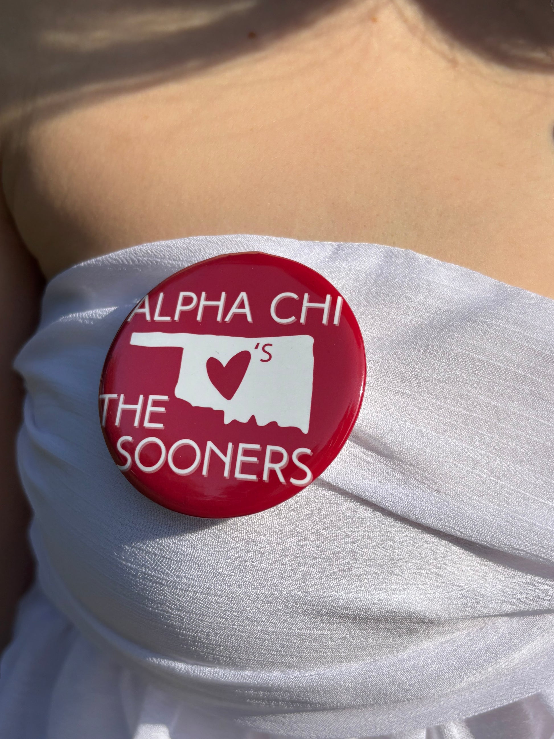 Show off your sisterhood and Sooner pride with this sweet Oklahoma-inspired button. Featuring your sorority name front and center, it’s the perfect way to rep both your chapter and your team on game day.