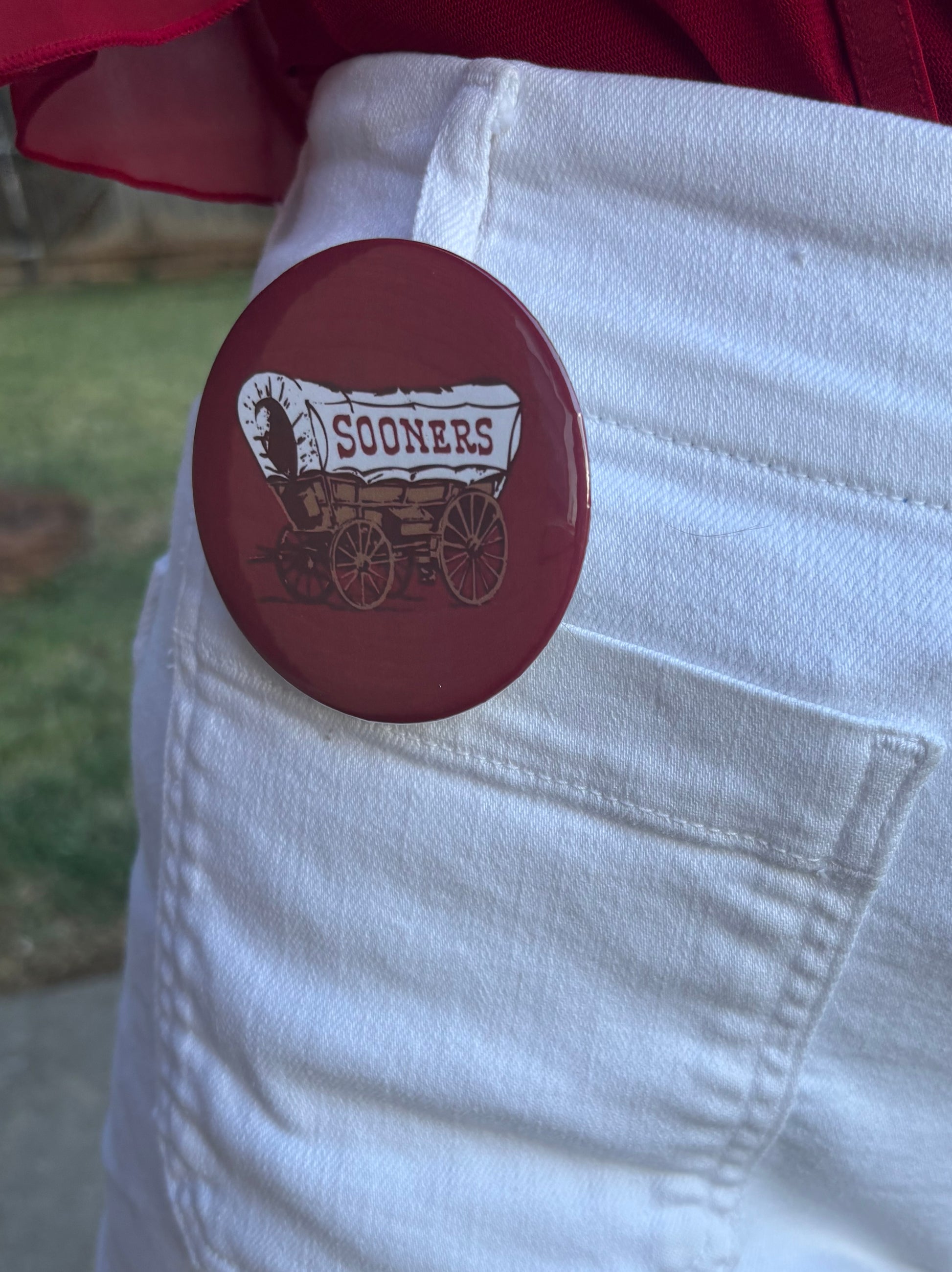 A true OU icon, the Sooner Schooner represents tradition, pride, and the spirit of game day. This vintage-inspired button captures the charm of the wagon in bold crimson, making it the perfect accessory for fans who love celebrating Sooner history in style. Wear it to the game, tailgate, or anywhere you want to show off your roots.